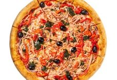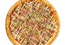 32 см/500-600 г • Ветчина, шампиньоны, перец сладкий, маслины, лук, соус базилик, томатный соус, моцарелла, чесночное масло, орегано