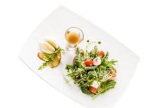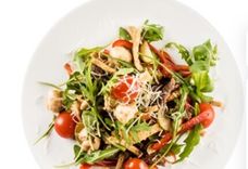 200 г • Руккола, обжаренные кусочки говяжьей вырезки, шампиньоны, томаты Черри, перец свежий, огурец маринованный, крутоны, заправка Французская, глазурь Ponti, сыр Грано Падано